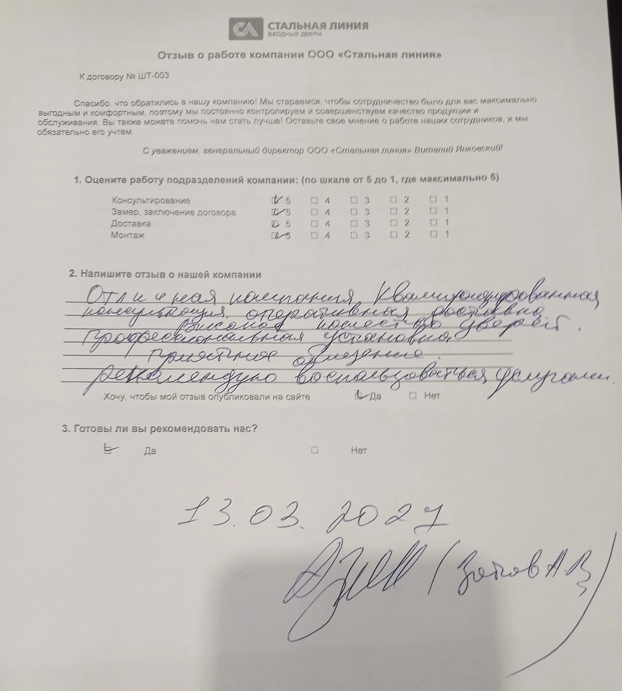Отличная компания. Квалифицированная консультация, оперативная доставка. Высокое качество дверей. Профессиональная установка. Приятное общение. Рекомендую воспользоваться услугами