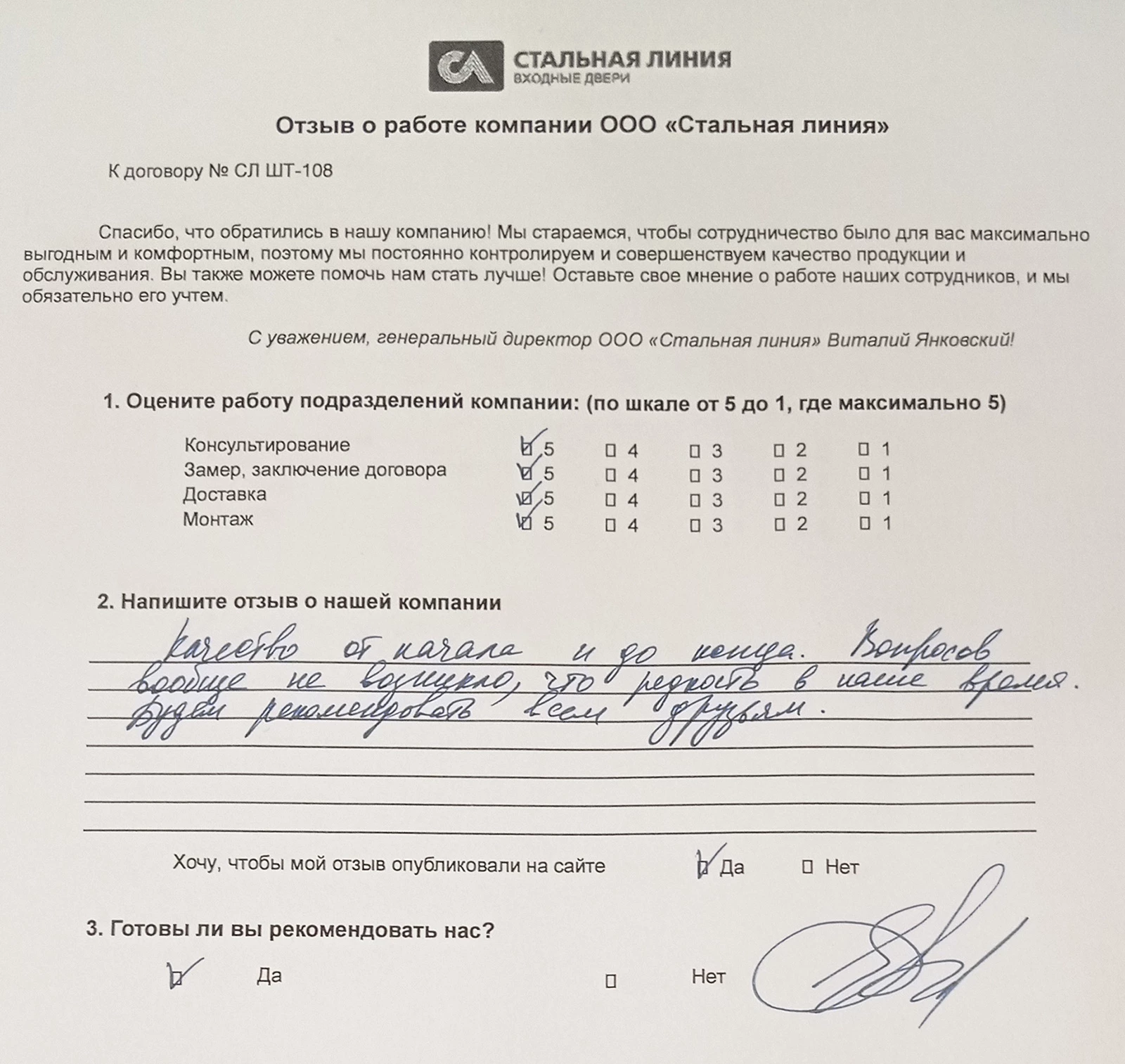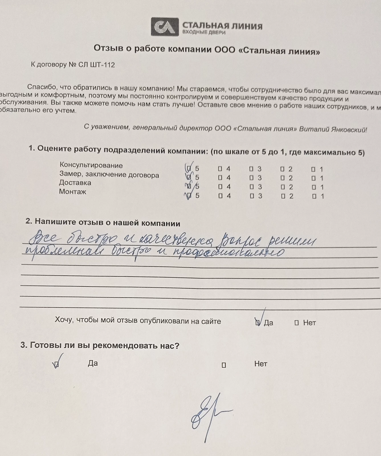 23 ноября приехали, выбрали входную дверь Монтана. Сотрудники грамотно проконсультировали и быстро оформили документы. Сделали хорошую скидку, что не могло нас не порадовать))) доставку и монтаж организовали уже на 24 ноября! Установили дверь качественно и быстро, мы остались очень довольны! Однозначно рекомендую компанию «Стальная линия» всем, кто хочет установить дверь