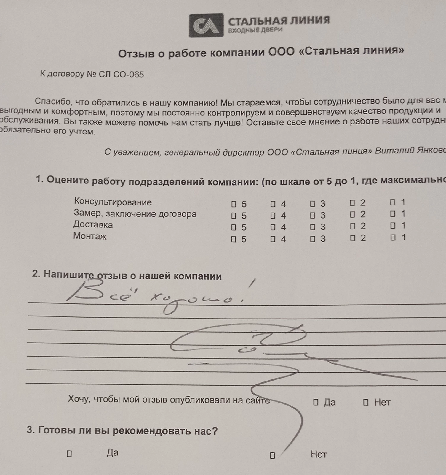 Все отлично, все устраивает. Услугами по монтажу довольны. Будем советовать друзьям и знакомым. Команде Стальная линия большое спасибо!